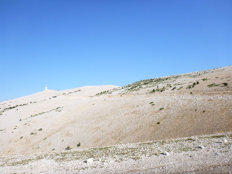 Die Beine arbeiten immer noch gut bis sehr gut, so dass ich diesen Abschnitt in vollen Zügen genießen kann. Auch wenn ich sagen muss, dass der Mont Ventoux sein HC zu recht hat. Und der Ausblick der sich immer wieder bietet ist schlicht atemberaubend. Natürlich schieße ich zwischendurch immer wieder Fotos, was zwar etwas aus dem Kletterrhythmus bringt, denn schließlich muss ich die Kamera aus dem Trikot nesteln, den Schweiß vom Objektiv wischen, fotografieren und die Kamera wieder ins Trikot reinwursteln. Aber die Motive entschädigen für die Mühe. Jetzt, noch zwei Kilometer vor der Passhöhe, kann ich die klassischen Mont Ventoux Fotos machen wie man sie aus der Tour Berichterstattung kennt, wenn um den Etappensieg oder die Bergwertung gekämpft wird.